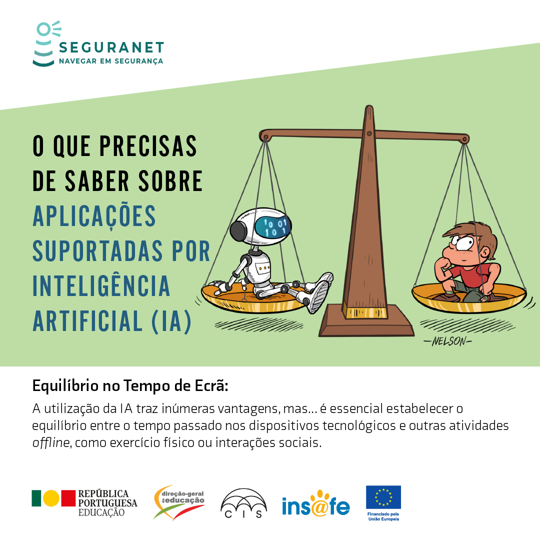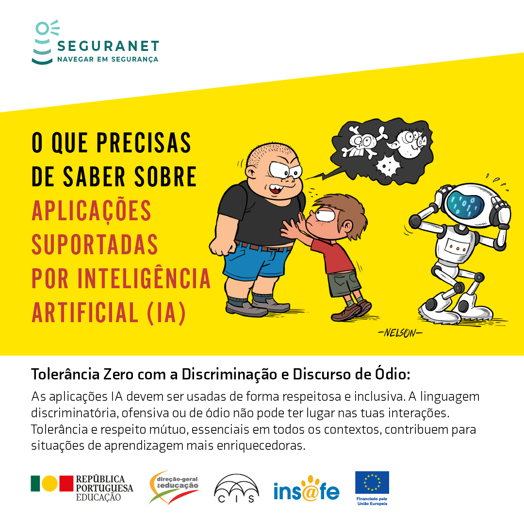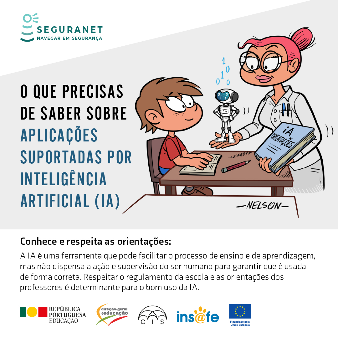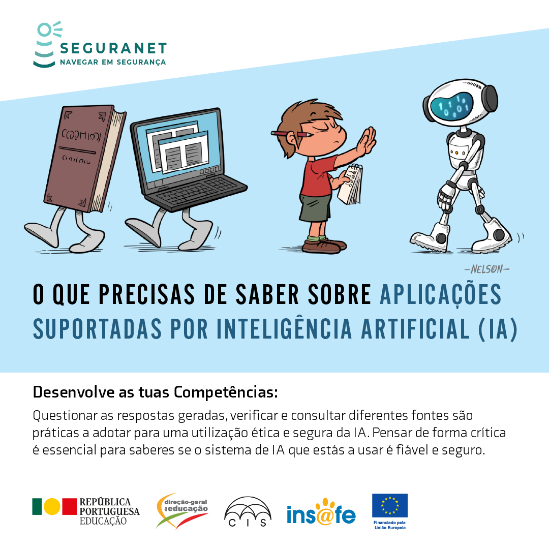 A Direção-Geral da Educação, no âmbito do Centro de Sensibilização SeguraNet e enquadrada na ação do Centro Internet Segura, promove a campanha informativa "Aplicações Suportadas por IA".