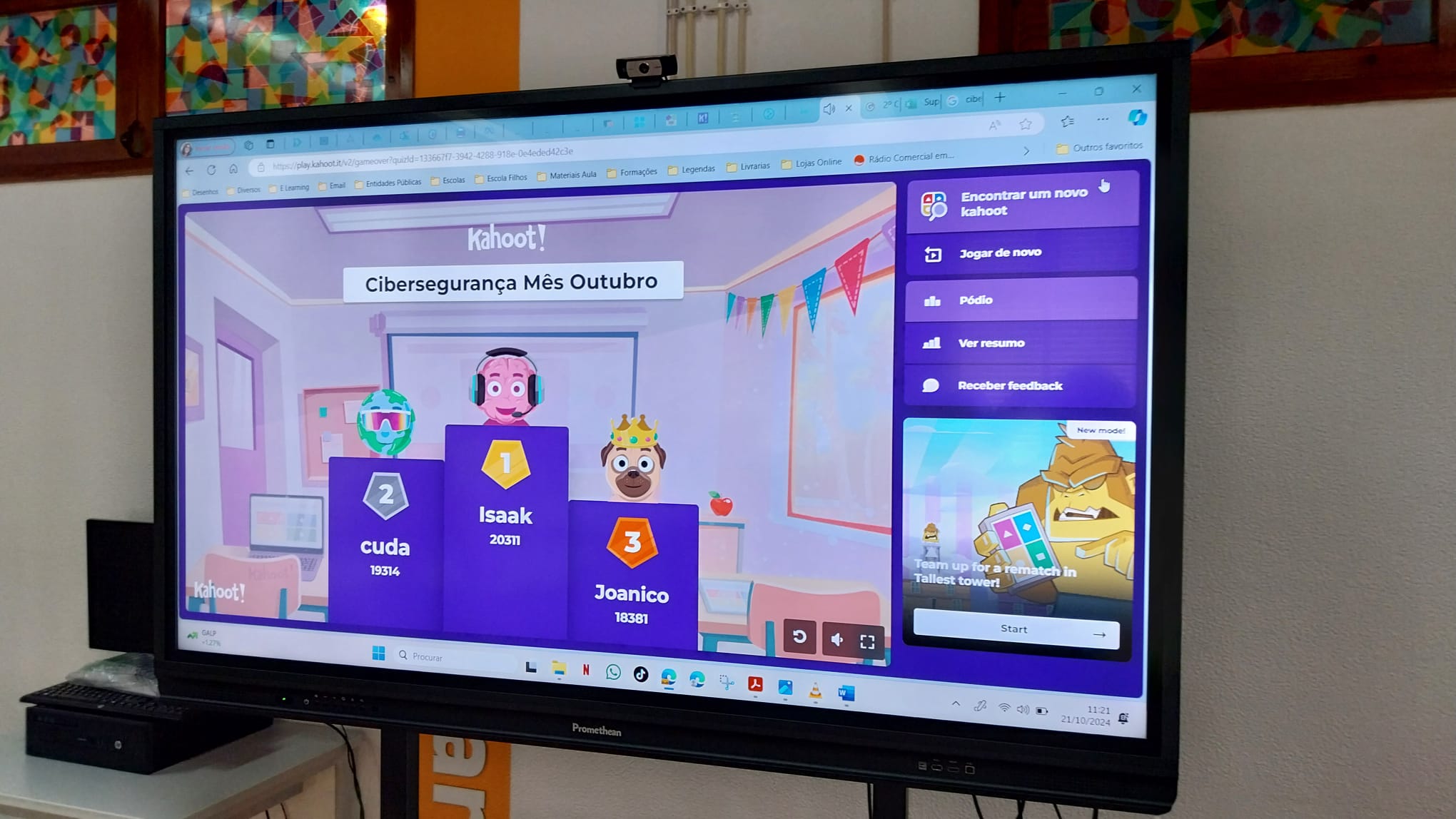 Kahoot sobre Cibersegurança; Atividades no site Bué Seguro; Visionamento dos vídeos recomendados e debates