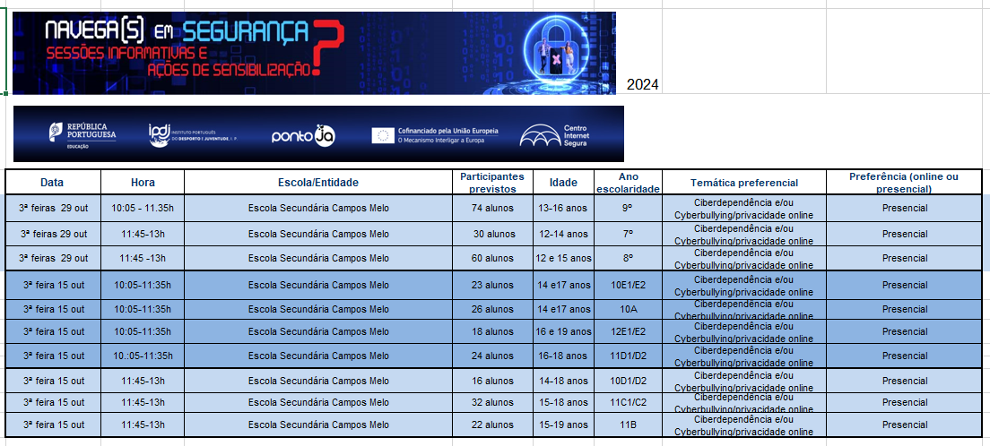 Entre os dias 15 e 29 de outubro, serão realizadas sessões informativas e de sensibilização do programa “Navega(s) em Segurança?”, abordando os temas “Ciberdependência” e “Cyberbullying/Privacidade Online”, em várias turmas, em colaboração com o IPDJ de Castelo Branco. Os Encarregados de Educação/Pais e seus educandos são convidados a participar no webinar “Missão Cibersegura”, dinamizada pela Polícia Judiciária na Prevenção do Cibercrime, a ter lugar no 18 de outubro.