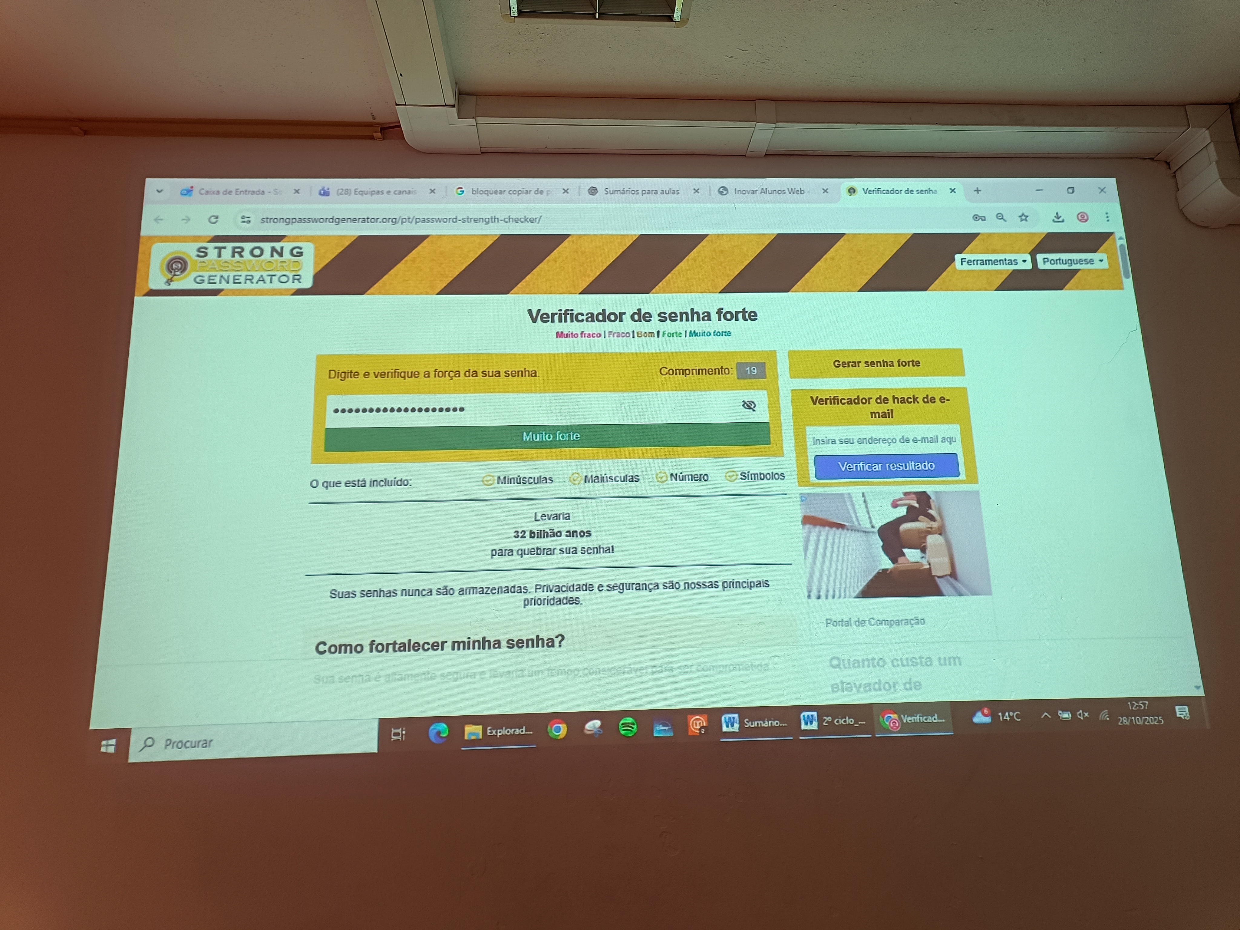 Digita no computador do professor, no site de verificação, a palavra-passe. Devolve informação sobre a sua força e segurança, nomeadamente o comprimento da palavra-passe, tempo estimado para adivinhar a palavra-passe e tipos de caracteres utilizados.