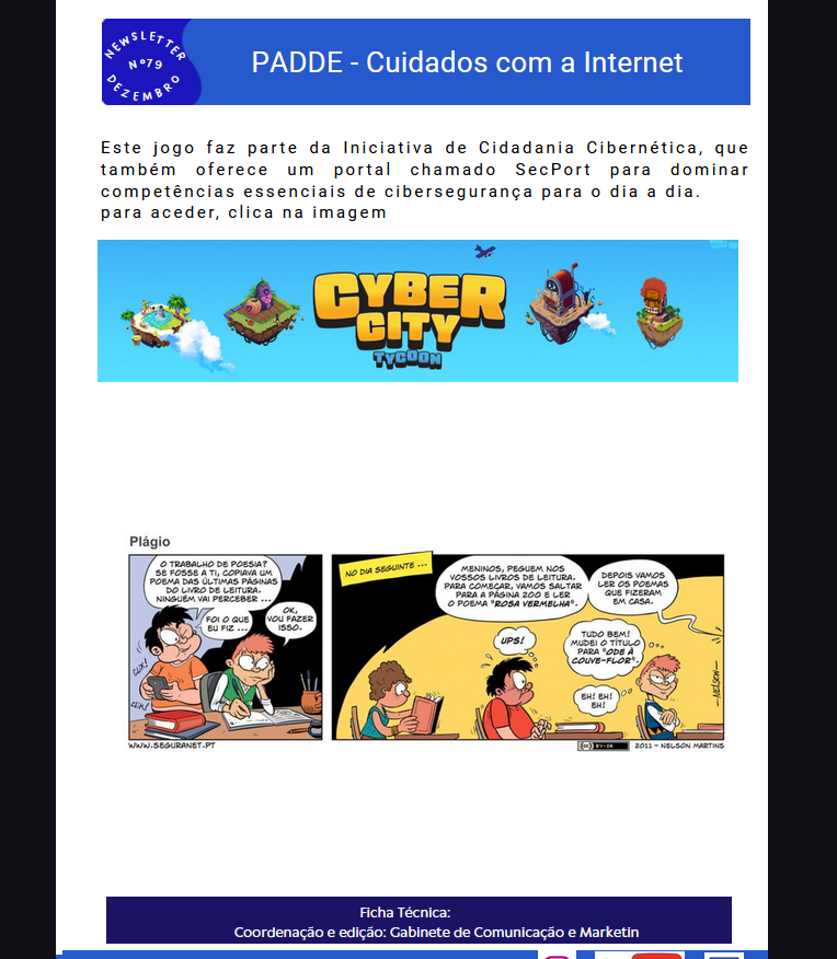 -O agrupamento elabora mensalmente uma newsletter que distribui pela comunidade educativa em que apresenta as atividades que se realizaram nesse mês e na página final divulgam-se sempre conteúdos relativos à segurança na internet, nomeadamente as tiras de BD e vídeos. Esta atividade é para todo o agrupamento;