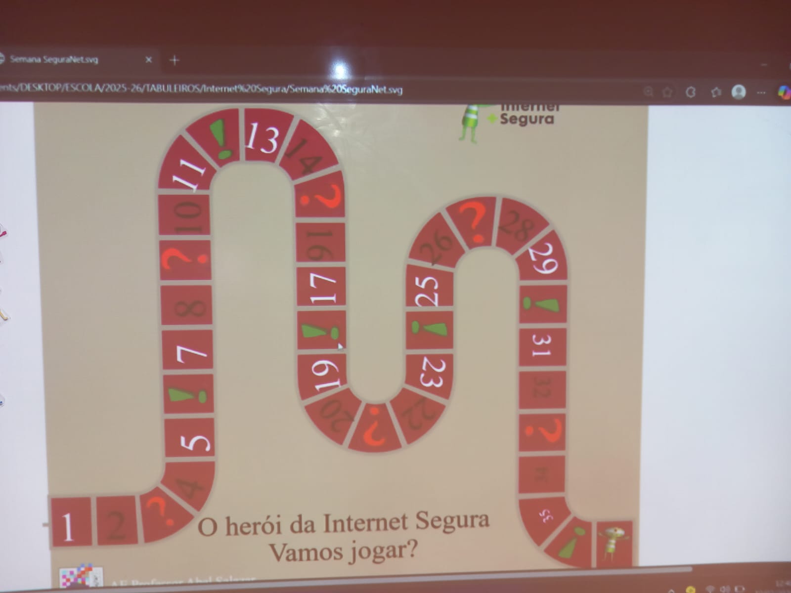 A atividade consistiu num Jogo da Glória onde eram abordados comportamentos, corretos ou perigosos, a ter no uso da Internet, Redes Sociais.
