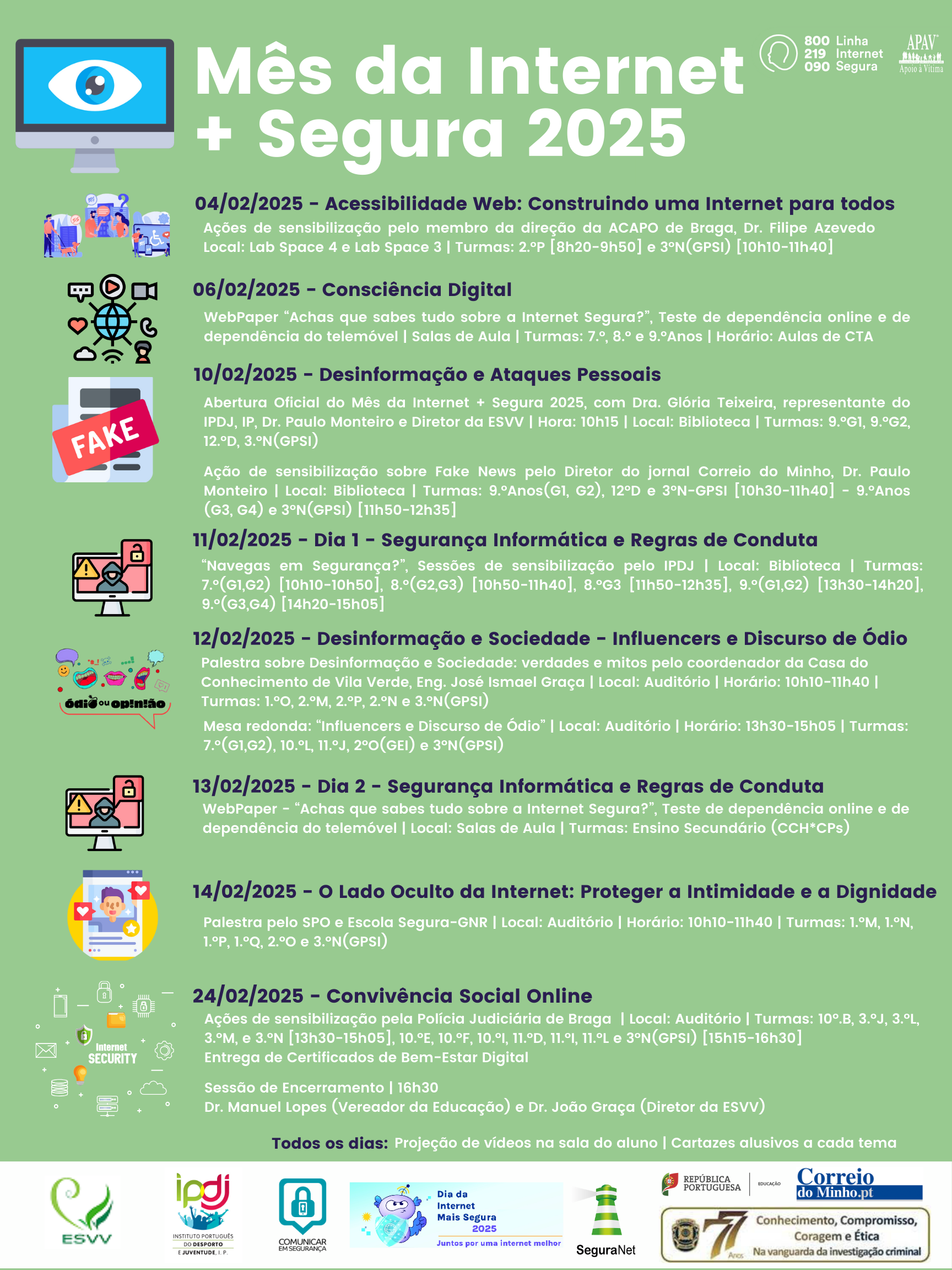 No âmbito do Dia da Internet +Segura, celebrado a 11 de fevereiro de 2025, o grupo disciplinar de Informática em colaboração com a turma do 3.ºN do curso profissional de Técnico de Gestão e Programação de Sistemas Informáticos, a Equipa da Biblioteca e o SPO, assinalam a data com a dinamização de atividades de cidadania digital, durante o mês de fevereiro. Pretendemos envolver a nossa escola nesta iniciativa. Assim, para assinalar este mês, organizamos palestras e sessões de brainstorming sobre diversas temáticas para reforçar a educação para a cidadania digital bem como a visualização pública de vídeos e imagens de sensibilização da comunidade escolar, elaborados pelos alunos do 3.ºN-GPSI.