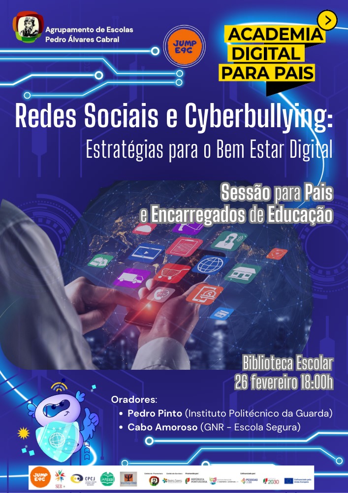 Dia 19 e 20 de fevereiro serão realizadas sessões com a colaboração da GNR-Escola Segura sobre ciberbullying e Bem estar Digital, para os alunos do 5º ao 8º ano e no dia 26 de fevereiro uma sessão para Pais e Encarregados de Educação também com a colaboração da GNR-Escola Segura e o Eng. Pedro Pinto do IPG.
